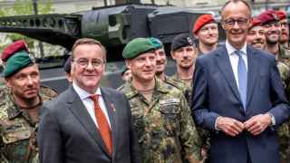 Борис Писториус,министр обороны ФРГ (слева в пиджаке),и Фридрих Мерц,канцлер,среди германских военных
